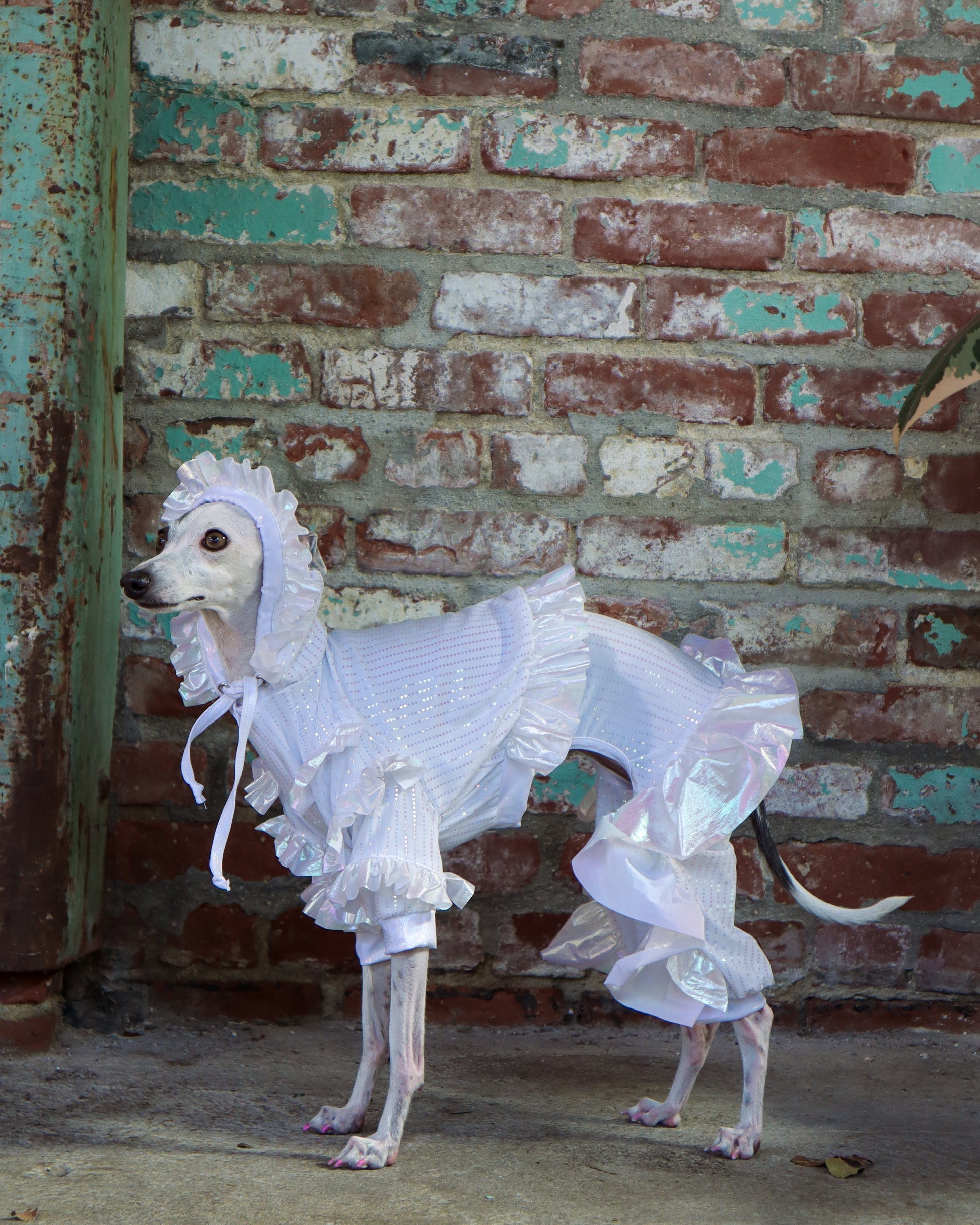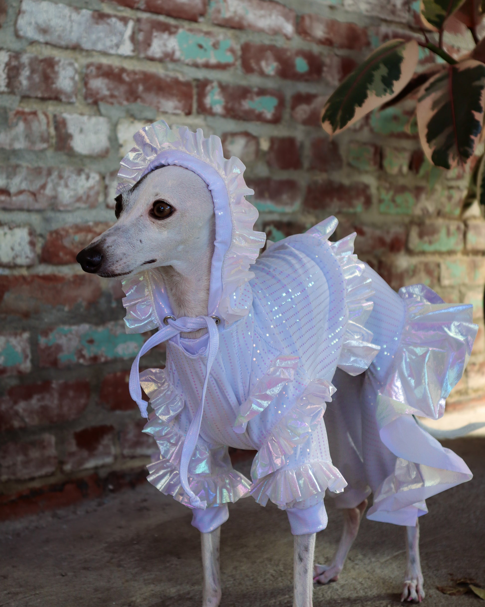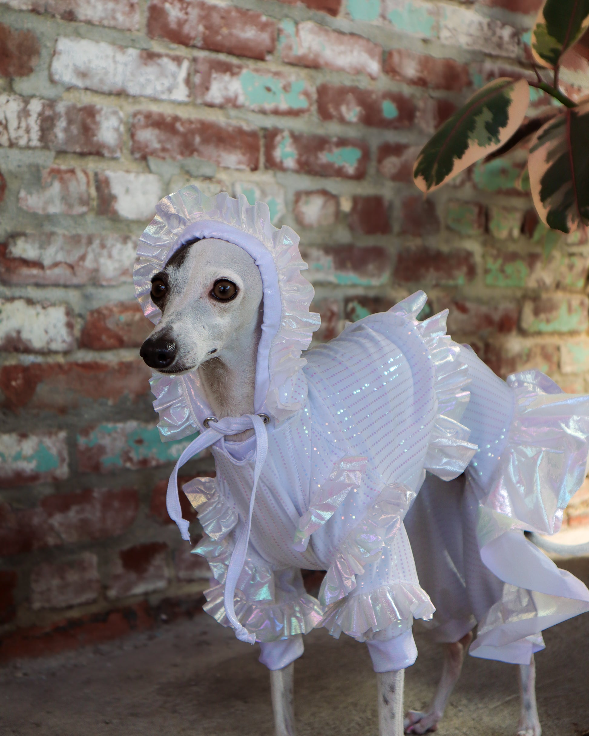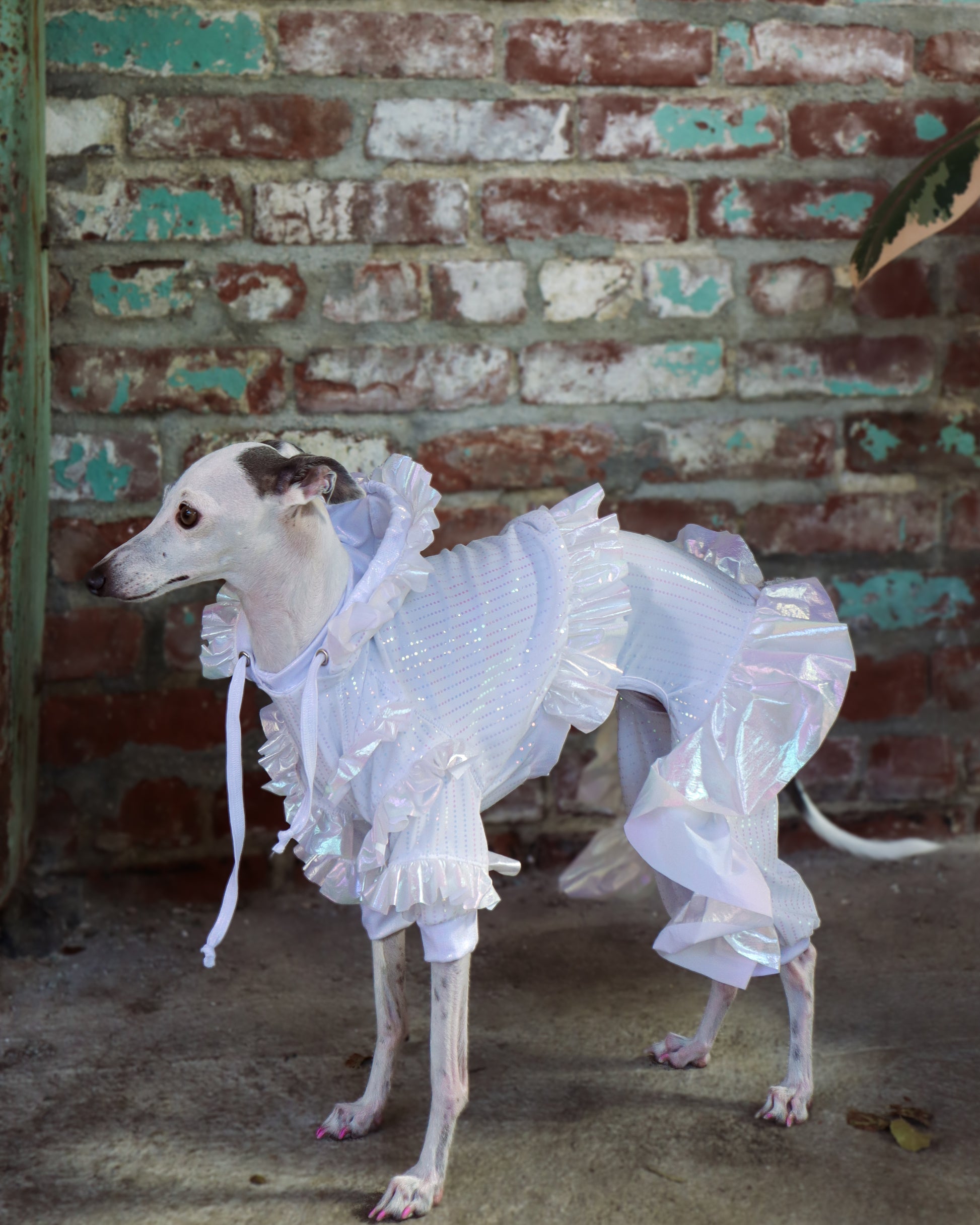 Crafted from soft white stretch with iridescent accents and holographic details, the lightweight, floaty fabrics ensure your pup moves with freedom and elegance. The Tika Sweatshirt pairs beautifully with the Tika Jumpsuit or can shine on its own as a statement of dainty, couture-inspired charm.